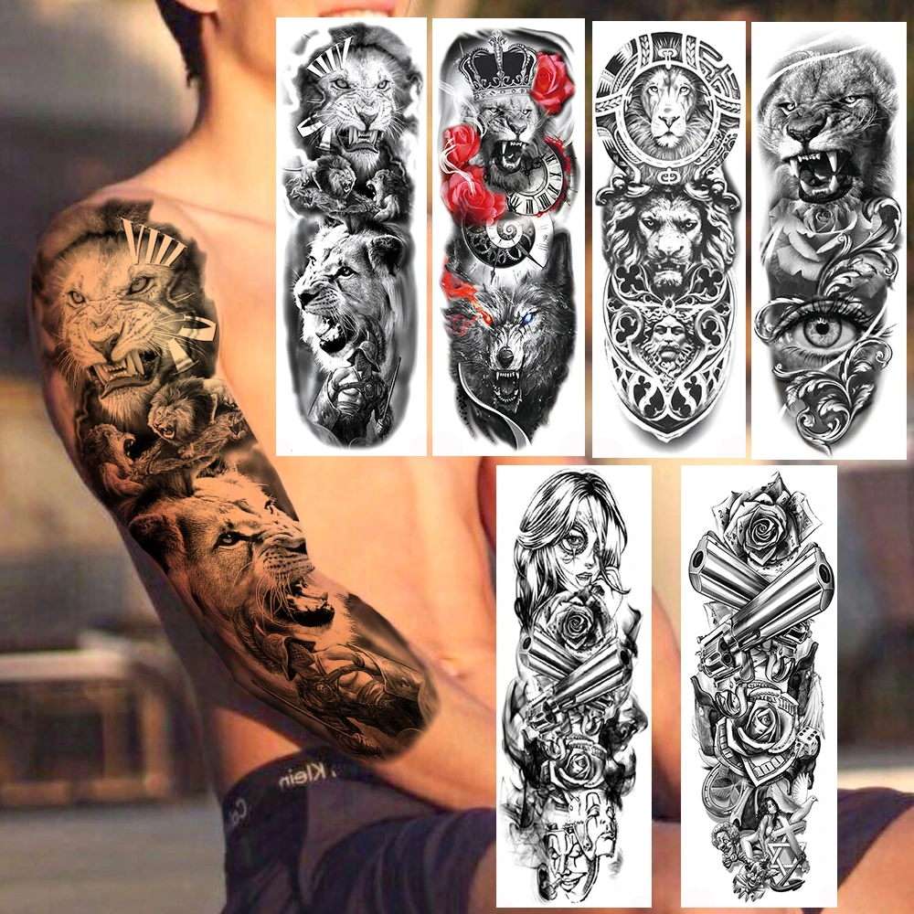 Faux Tatouages Sur Les Bras Du Roi Lion Pour Hommes Et Femmes Autocollant Realiste Manches Longues Totem Noir Loup Guerrier Rose Tatouages Temporaires Aliexpress