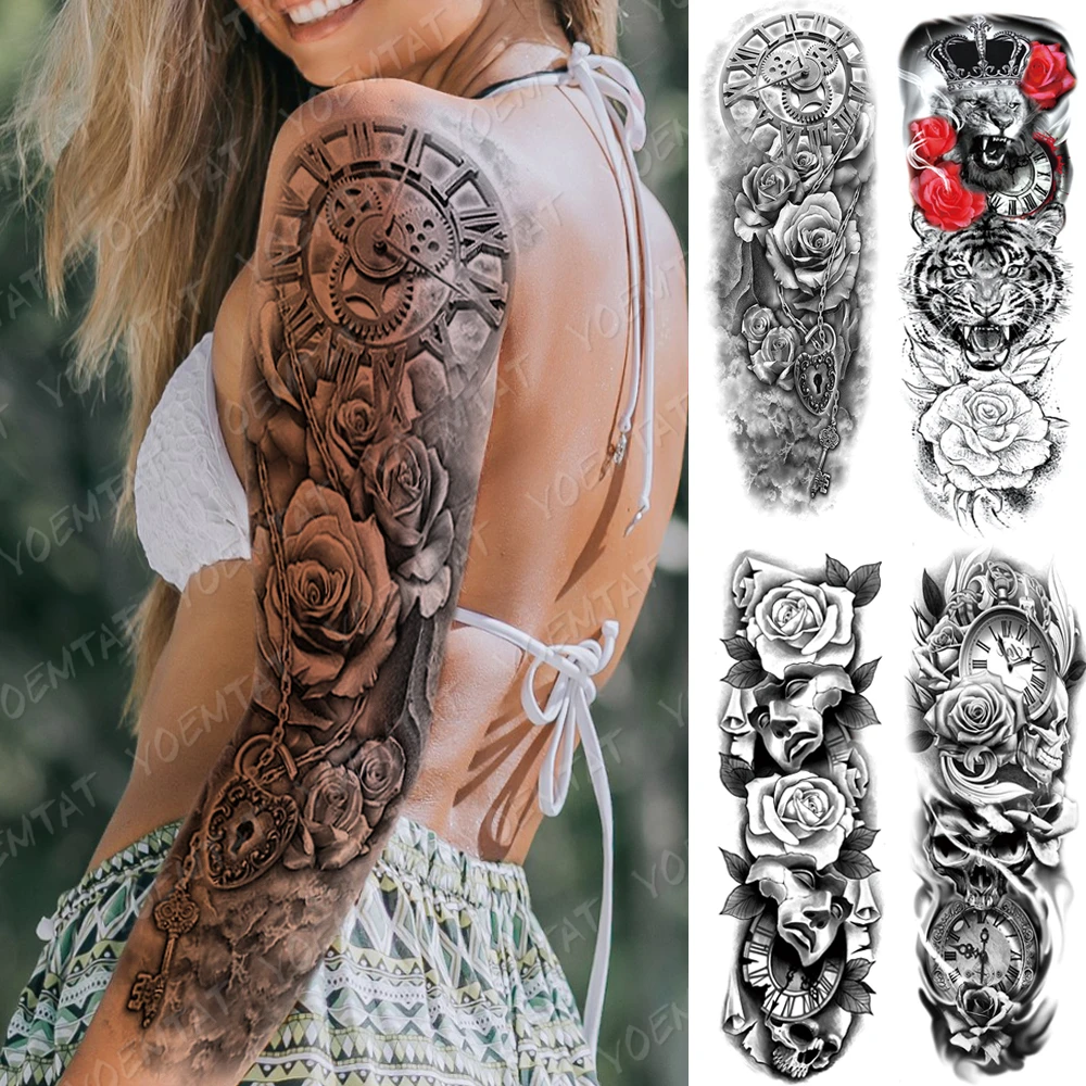 Grand Bras Manches Tatouage Lion Tigre Horloge Impermeable Temporaire Tatto Autocollant Rose Masque Body Art Complet Faux Tatoo Femmes Hommes Aliexpress