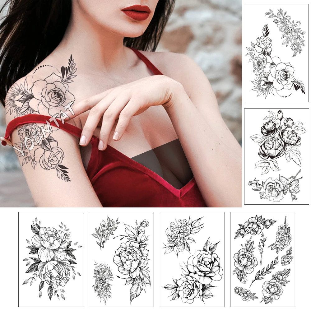Daun Rose Peony Renda Bunga Tahan Air Sementara Tato Stiker Hitam Besar Tattoo Seni Tubuh Bahu Palsu Tato Untuk Wanita Sementara Tato Aliexpress