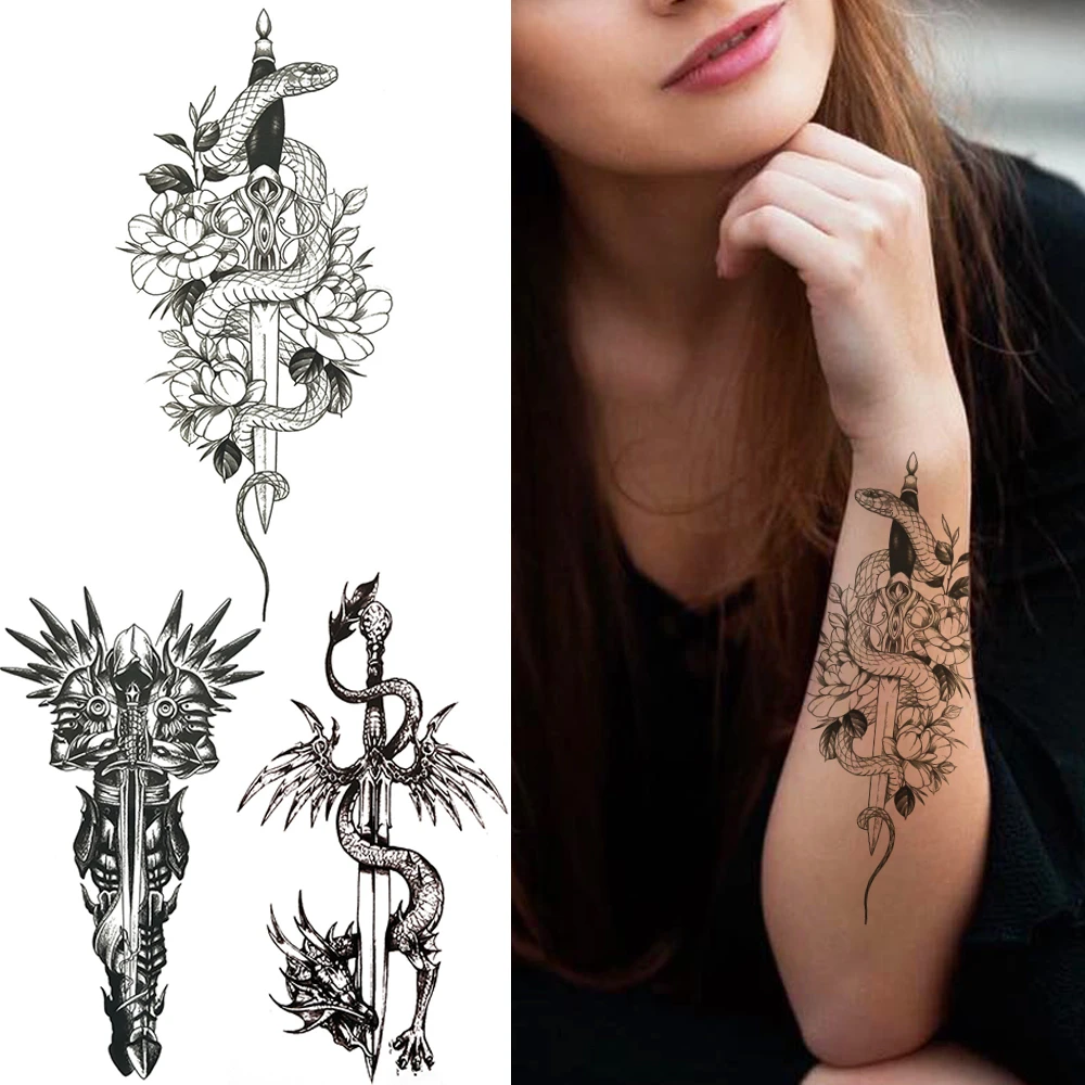 Tatouage Temporaire De Serpent Noir Pour Femmes Et Hommes Autocollant De Fleur Grande Epee De Gladiateur Faux Tatouages Poitrine Dos De Dragon De Guerrier Aliexpress